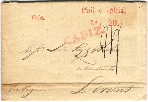 The letter is dated Philadelphia, March 27, 1782 and is from John Barclay & Company and is addressed to a merchant at L'Orient, France. The letter is endorsed to be carried "Via Virginia" at lower left. The letter bears a red "Philadelphia May 20" two line postmark and matching "Paid" handstamp. The marking matches the listing in the American Stampless Cover Catalog but is atypical for Philadelphia in two regards. The usual Philadelphia postmarks of this period are all upper case letters and are all abbreviated to one extent or another. Further, all of the markings reported in the catalog are impressed in black ink. Another anomaly is that the letter does not bear any American postal rate. The "1." that appears at top right is a notation that this is a single sheet letter.