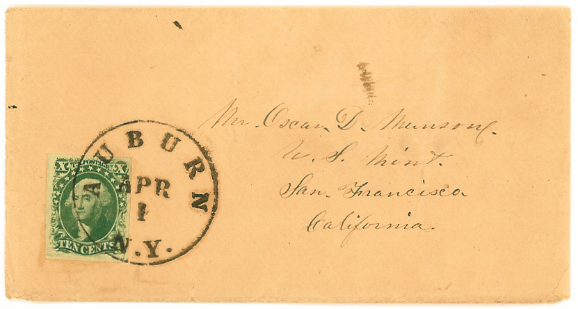 | The March 3, 1855 Act of Congress, effective April 1, 1855, set the postal rate for a single letter sent over 3,000 miles at ten cents. The 10¢ stamp was issued in May 1855 for prepayment of this postal rate. |