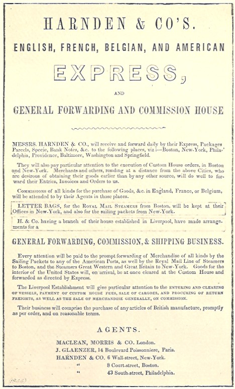 Prior to 1848, prepaid mails to foreign destinations was possible only by using agents such as Harnden. For example, a letter prepaid to Harnden in Boston could be sent by steamer to the Liverpool office and mailed by the Harnden agent there, using the British postal system, to any destination linked from England.